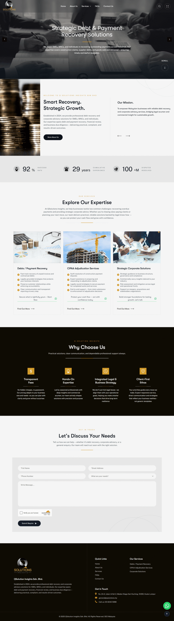 Q Solutions Insights offers debt recovery, CIPAA adjudication, and strategic corporate advisory services in Malaysia to resolve outstanding payments efficiently and lawfully, with particular expertise in construction claims, supplier debts, and goods sold and delivered.