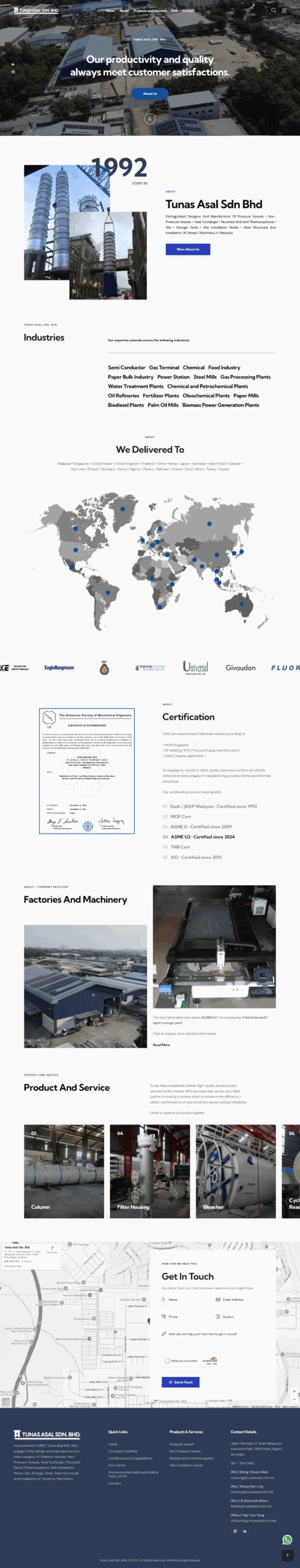 Incorporated in 1992, Tunas Asal Sdn. Bhd. engage in the design and manufacture of a wide category of pressure vessels, non-pressure vessels, heat exchangers, mounted skids & thermosyphons, site installation works, silo, storage tanks, steel structural and installation of vessels or machinery.